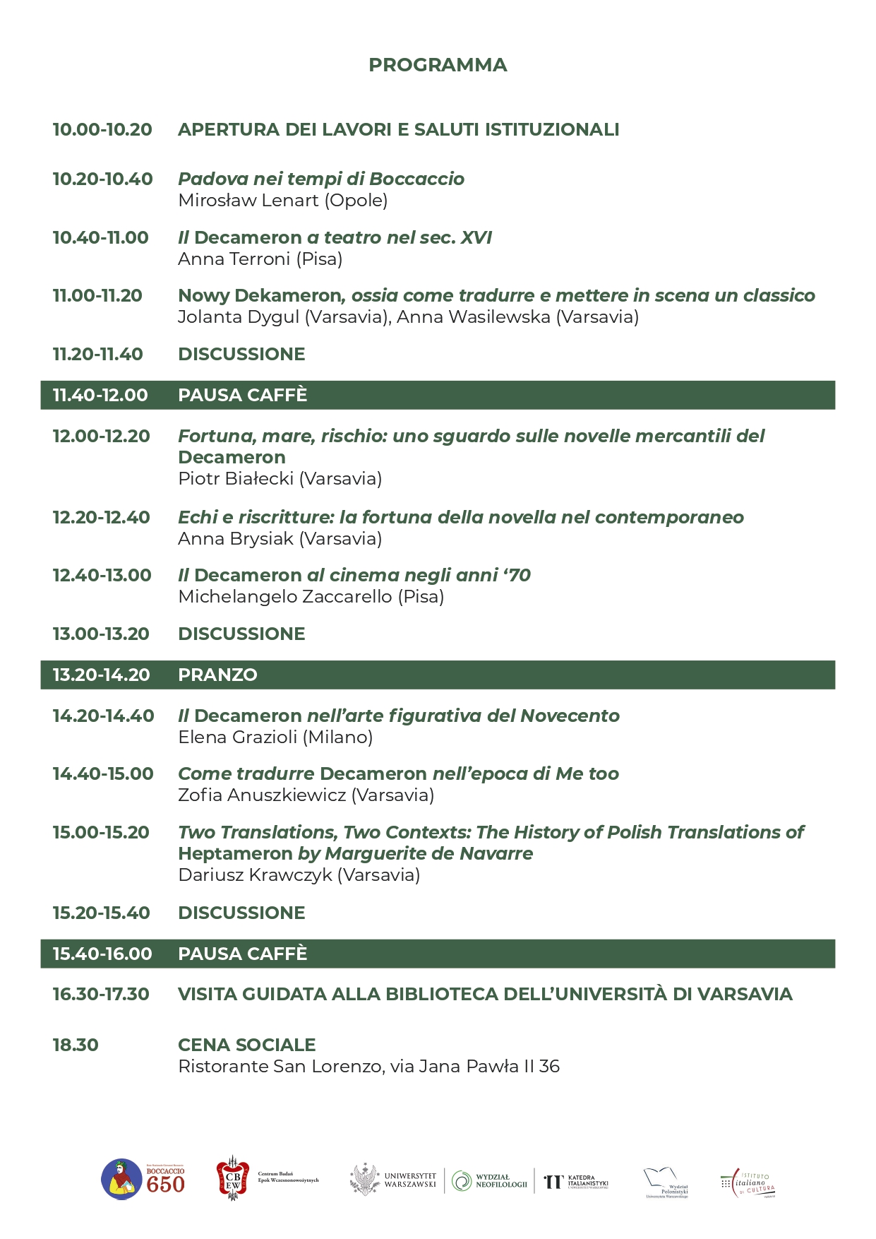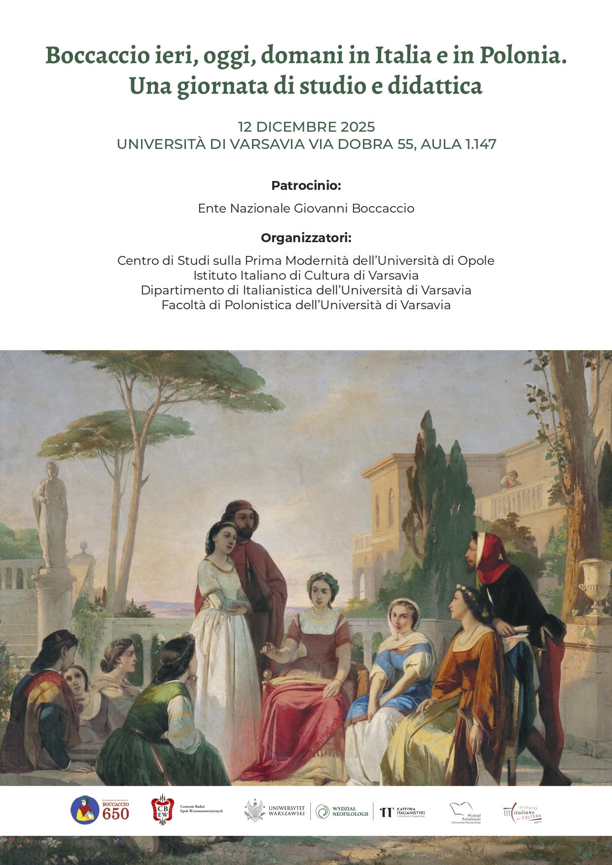La giornata di studio “Boccaccio ieri, oggi, domani in Italia e in Polonia” riunisce esperti di italianistica, traduzione e studi letterari per esplorare la fortuna e la ricezione dell’opera di Giovanni Boccaccio nel contesto italiano e polacco, dal Medioevo alla contemporaneità.