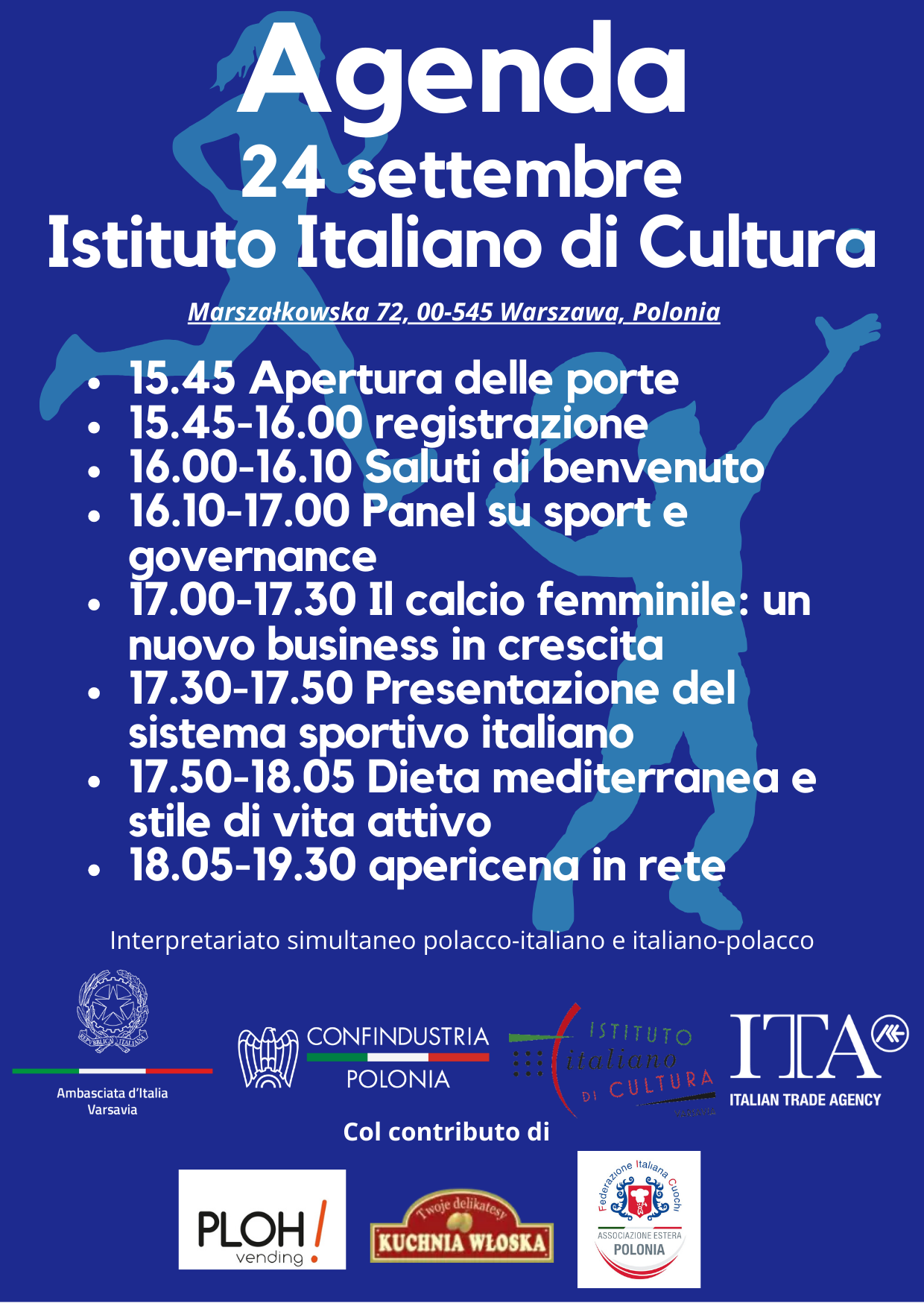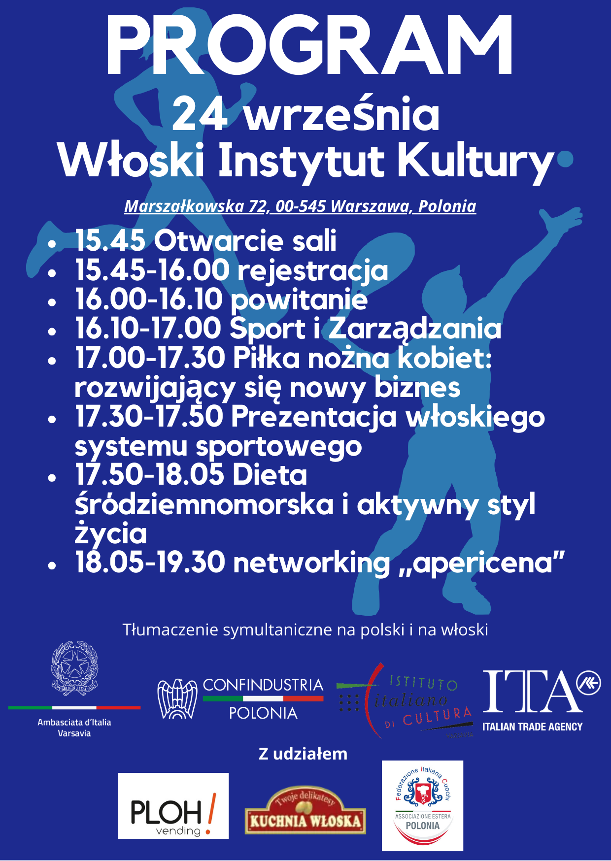In seguito, il Direttore di ICE Agenzia Varsavia, Roberto Cafiero, presenterà il settore dell’economia sportiva in Italia, evidenziando le potenziali opportunità commerciali nei rapporti italo-polacchi. L’ultima parte dell’evento sarà dedicata all’alimentazione, con una presentazione del Prof. Panczyk sulla dieta mediterranea e il suo legame con uno stile di vita attivo.