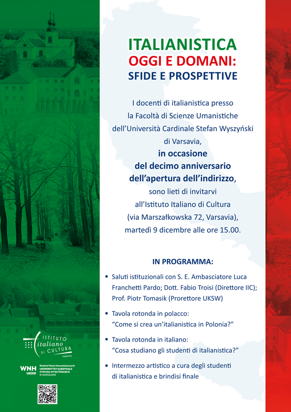 W 2025 roku obchodzimy dziesiątą rocznicę powstania filologii włoskiej na Wydziale Nauk Humanistycznych Uniwersytetu Kardynała Stefana Wyszyńskiego w Warszawie. Z tej okazji serdecznie zapraszamy do Włoskiego Instytutu Kultury, by w gronie ekspertów, wykładowców i studentów zastanowić się nad kierunkiem rozwoju badań naukowych oraz nad zmianami w nauczaniu języka i kultury włoskiej w Polsce w ostatniej dekadzie.